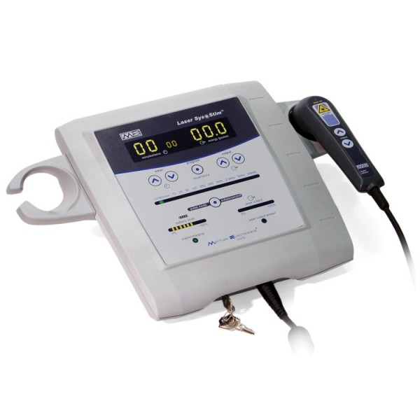 The Mettler Electronics Laser Sys*Stim™ comes with a 785 nm laser probe with  visible blue LEDs that illuminate the treatment field. An optional SLD/LED  cluster probe with 950 nm SLDs and 660 nm LEDs is also available. The Laser  Sys*Stim allows the clinician to set treatment time, continuous/pulse modulation  modes and laser output energy. All treatment parameters are displayed on the LED  displays and controlled via the membrane keypad. There are holders integrated  into the unit to store applicators when not in use. Laser output can also be  adjusted via controls on the both laser and cluster applicators.